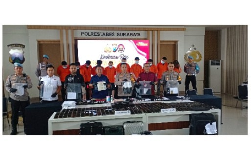 Selanjutnya AKBP Wimboko menjelaskan bahwa berdasarkan penyelidikan, Polrestabes Surabaya berhasil mengamankan 10 tersangka beserta barang buktinya, terdiri dari 9 warga negara China dan 1 warga negara Vietnam,” jelasnya