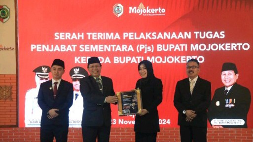 Dalam acara serah terima jabatan yang berlangsung di Pendopo Graha Maja Tama (GMT) Pemkab Mojokerto, Pjs Bupati Mojokerto Akhmad Jazuli menyerahkan memori nota pelaksanaan tugas kepada Bupati Mojokerto Ikfına Fahmawati. Penandatanganan serah terima jabatan itu juga dihadiri oleh Asisten Pemerintahan dan Kesra Jawa Timur yang mewakili Gubernur, Sabtu (23/11/2024)