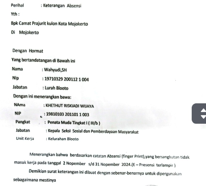 Surat Keterangan Absensi yang ditujukan ke Camat Prajuritkulon, Kota Mojokerto tertanggal 2 Desember 2024, bahwa oknum tersebut tidak masuk kerja selama 29 hari, yakni tanggal 2 sampai 31 Nopember 2024.