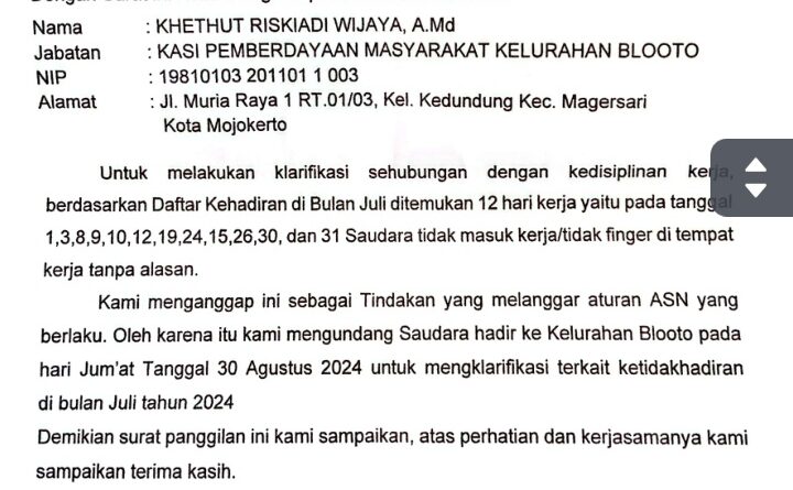 Informasi yang masuk ke Redaksi bahwa, selama tahun 2024 – 2025, oknum Kepala Seksi Sosial dan Pemberdayaan masyarakat Kelurahan Blooto, tidak masuk kerja atau tidak Finger di tempat kerja tanpa alasan lebih dari 71 hari.