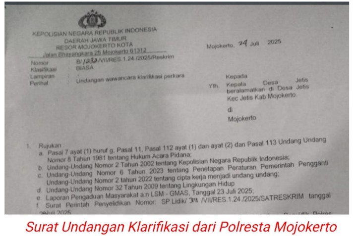 Kepala Desa Jetis juga mengirimkan Surat Undangan Klarifikasi Perkara dari Polresta Mojokerto bernomor : B/232/VII/RES.1.24 /2025/Reskrim, tertanggal 24 Juli 2025 ke awak media.